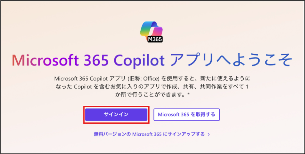 • Microsoft 365 ログインサイト の「サインイン」をクリックします。